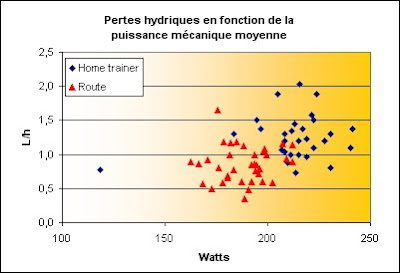 On note que la dispersion des résultats est plus grande dans le cas du home trainer (le coefficient de corrélation est presque 2 fois plus élevé sur route). On trouve une valeur pour le taux d'évaporation quasi semblable (x~0.4) sur home trainer et sur route. En revanche, la pente des droites donnent deux valeurs assez distinctes pour le coefficient d'échange hS (~8W/°C pour HT et ~12W/°C pour la route).